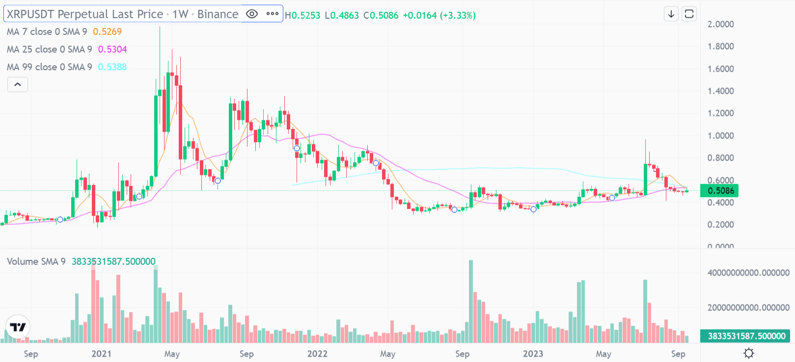 현재 리플은 0.5086달러, 한화로 약 680원 정도에 위치하고 있습니다. 위에 보이는 사진은 리플의 테더(Tether)차트입니다. 2021년 큰 거래량과 함께 거의 2달러까지 상승한 모습을 볼 수 있고 그 뒤로 약 2년간 하방으로 움직이는 모습을 볼 수 있습니다. 그 후 2022년 6월부터 얼마 전 SEC와의 승소 소식이 발표되기 전인 2023년 6월까지 1년간 장기적 관점으로 0.4달러에서 0.6달러 사이를 박스권 횡보하는 모습을 볼 수 있습니다. 2023년 바이낸스 월봉차트 기준으로 리플의 시세를 매달 나눠서 분석해 봤을 때 5월 시가는 0.4703달러로 시작해 0.5166달러로 마감하였습니다. 5월 가장 높았던 가격은 0.5292달러였고, 가장 낮았던 가격은 0.4067달러였습니다. 5월 한 달간 약 9.84% 상승한 모습입니다.