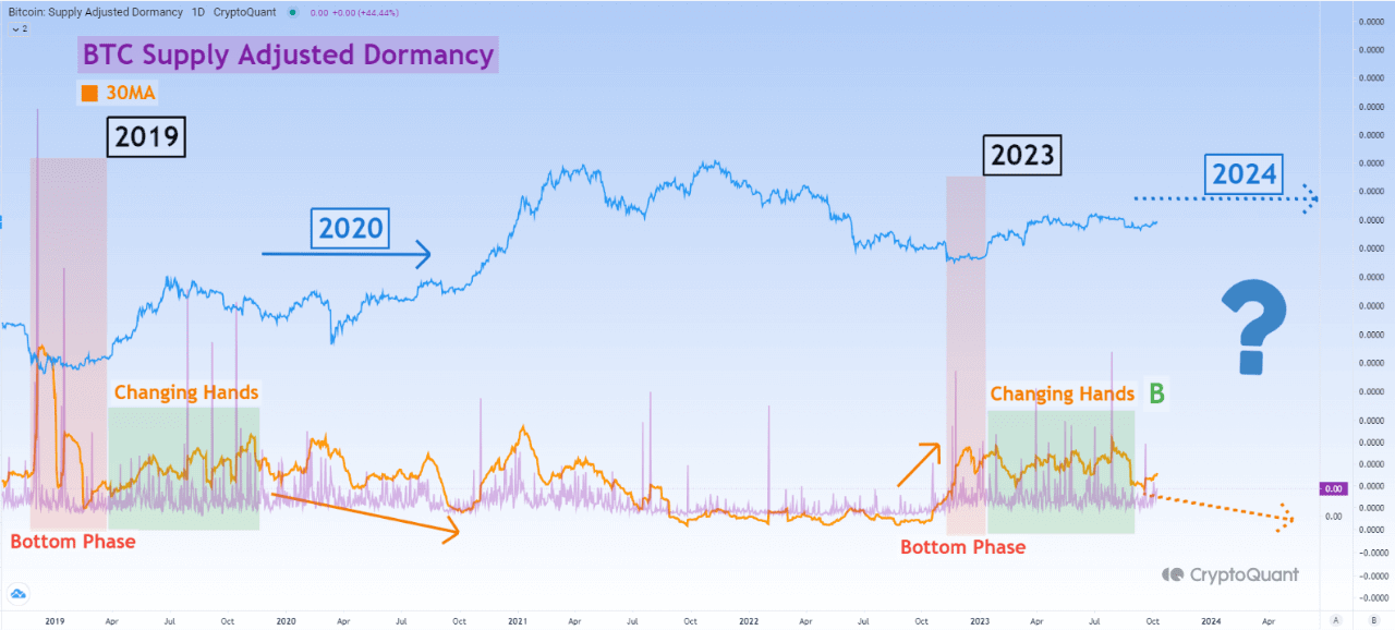 2023년도 이제 거의 끝이 보입니다. Dormancy 지표 역시 전보다 낮은 값을 보여주고 있고, 만약 2019년과 2020년처럼 비슷하게 흘러간다면, 지금처럼 비트코인 가격의 횡보는 길어지겠지만, 장기적인 투자관점으로 봤을 때 좋은 신호가 될 수도 있다고 생각합니다.