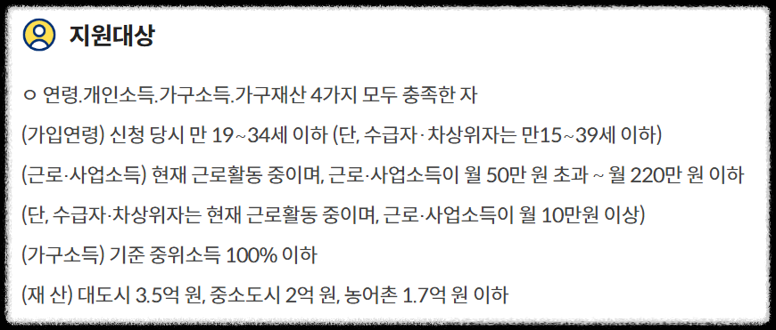 청년내일저축계좌의 지원대상은 아래의 4가지 사항을 모두 충족해야 합니다. 첫째, 계좌 신청 당시 만 19~34세 이하여야 하고 수급자나 차상위자는 만 15~39세 이하여야 합니다. 두 번째, 현재 근로활동 중이어야 하고, 근로·사업 소득이 월 50만 원을 초과하거나 월 220만 원 이하여야 합니다. 수급자나 차상위자는 현재 근로활동 중이어야 하고, 근로·사업 소득이 월 10만 원 이상이어야 합니다. 셋째, 가구소득이 소득인정액 기준 중위소득의 100% 이하여야 합니다. 넷째, 가구재산이 대도시는 3.5억 원 이하, 중소도시는 2억 원 이하, 농어촌지역은 1.7억 원 이하여야 청년내일저축계좌의 지원대상에 충족합니다.