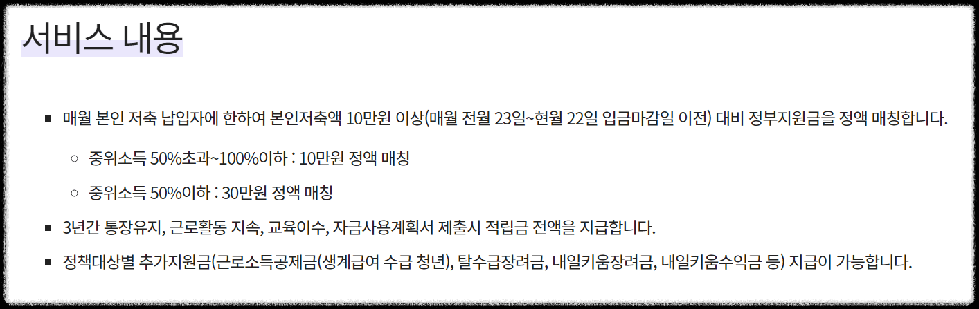청년내일저축계좌는 청년이 저축을 통한 자산형성을 지원하여 청년이 교육, 주거, 창업 등 미래에 투자하고, 위기에 대비할 수 있도록 지원하는 상품입니다. 근로활동을 하는 청년들의 자산형성을 돕기 위해 국가에서 청년 저축에 따른 기여금을 지원하는 정책입니다. 기준 중위 100% 이하 가구의 저소득 근로청년까지 지원대상을 대폭 확대하여 본인 적립금 10만 원에 정부지원금 10~30만 원을 매칭하여 지급합니다. 청년내일저축계좌는 소득에 따라 지원금이 달라집니다. 중위소득 50% 초과 100% 이하인 경우 10만 원 정액 매칭되고, 중위소득 50% 이하인 경우 30만 원이 정액 매칭됩니다.