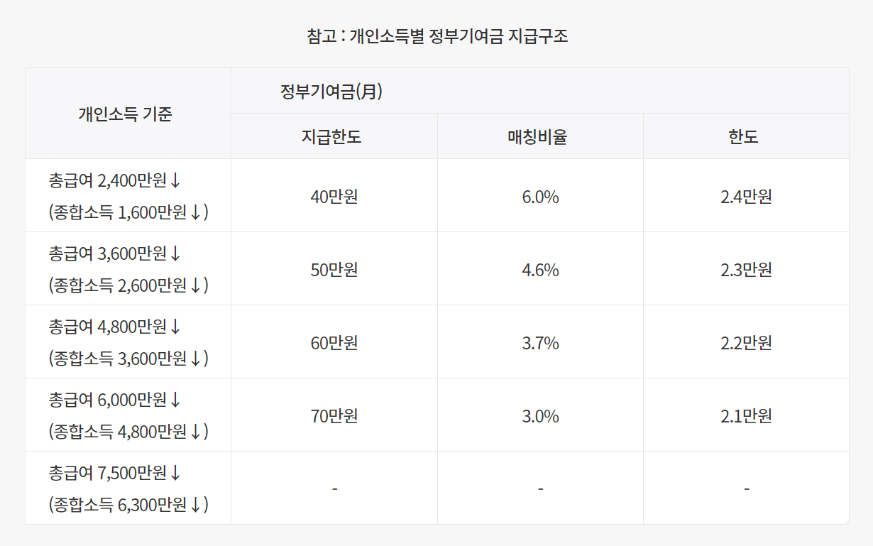 위의 표와 같이 소득이 적을수록 정부 기여금을 더 많이 받게 됩니다. 정부 기여금은 월납입금액에 비례해서 지급되는 것이 아닙니다. 예를 들어, 총급여가 2,400만 원 이하이고, 매달 70만 원을 넣는다고 생각했을때, 월 납입원금과 40만원 중 적은 금액을 지급하기 때문에 70만원을 납입해도 40만 원을 지급합니다.